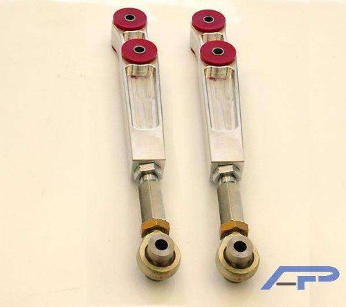 The solid 6061 aluminum is machined to spec to fit 2 urethane bushings with steel sleeves. Each urethane bushing is the same ones we use in our motor mounts with a hardness level of 88. Improving rigidity and handling and the vehicles dynamics, These control arms will allow you to setup extra camber and toe settings in the rear. The stock adjustments only allow for minimal changes, the AP arms give you a much more aggressive setup. The full race spherical rod ends fit into a steel extension offering 2 ways of adjustability. Either side includes a jam nut for secure locking and safety. The rod ends have precision machined spacers for a secure fit into the vehicle.